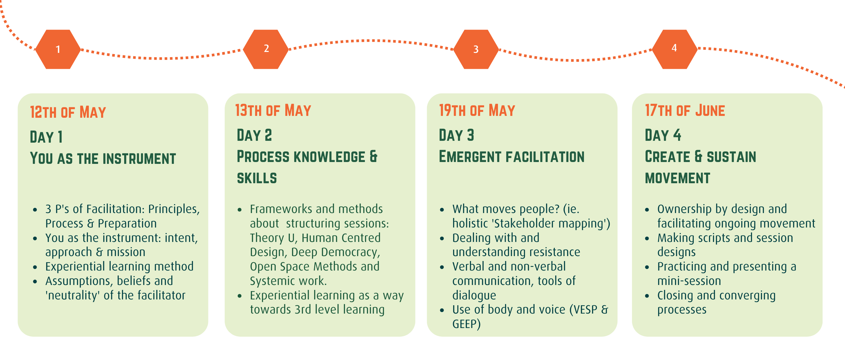 During a 4-day program over a period of 2 months, we will guide you through different facilitation methods and frameworks that help overcome resistance and group insecurity, give space to the minority perspective, and help bring together conflicting interests in organizations. During this journey, you will get to know like-minded people that are also working on systems change or are contributing in their way to organizational development.